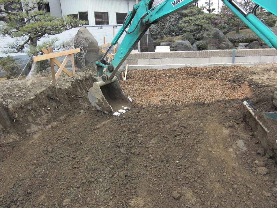 地盤調査に応じて表層改良(軟弱な場合は、柱状改良も行います。)