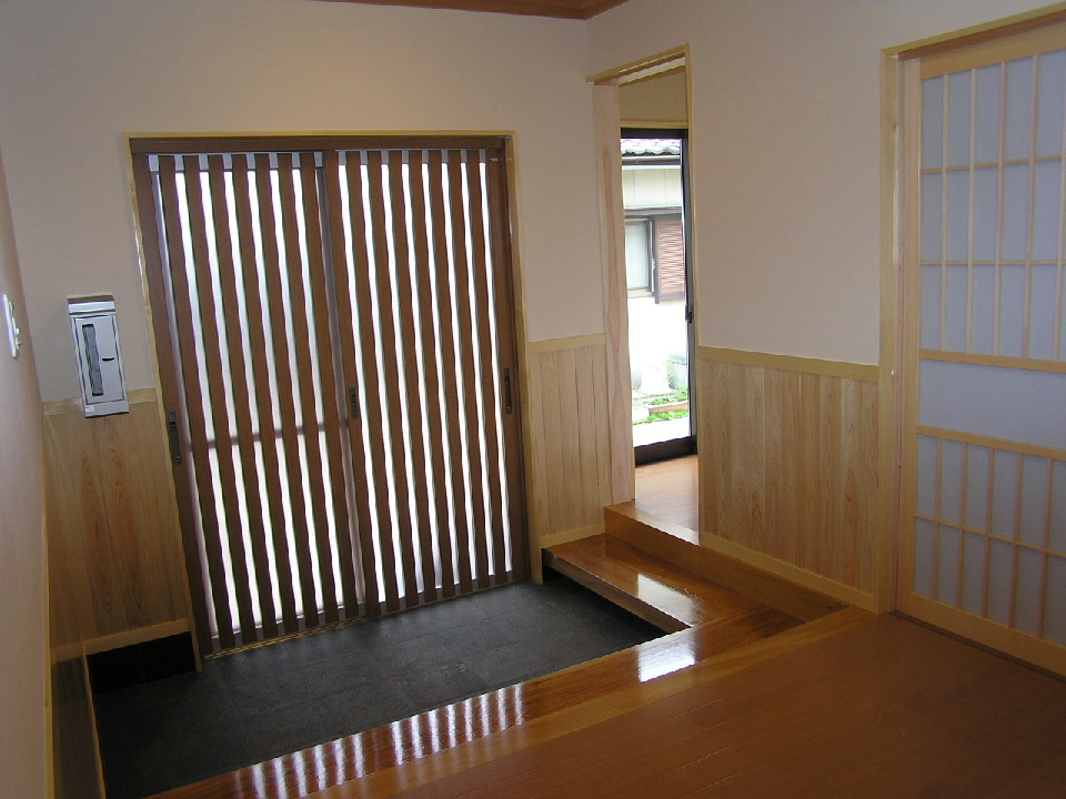 玄関扉は木調、廻りには化粧柱、梁を~床には石を使用した気品ある落ち着いた玄関に仕上がりました。