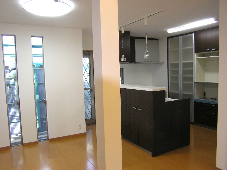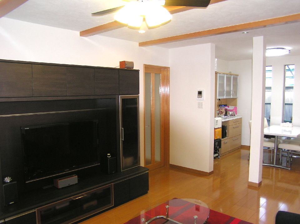 個別だったリビング・DK間の間仕切り壁を壊し、一間続きのLDKにリフォームしました。暗かったDKも明るくなり、また壁天井にはお客様の大好きな色である白色の珪藻土を塗りました。珪藻土って、とてもシックな感じに仕上がって大好きです。(大塚材木店社長(^◇^))