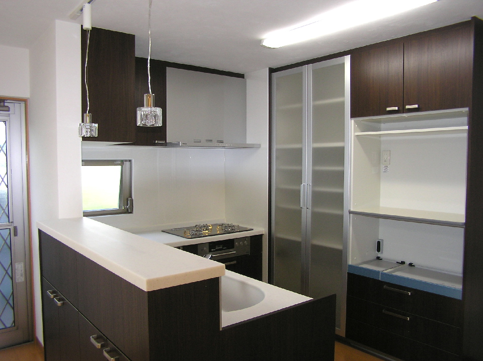 キッチンにはこげ茶色を…白い壁にとても合って良かったです。