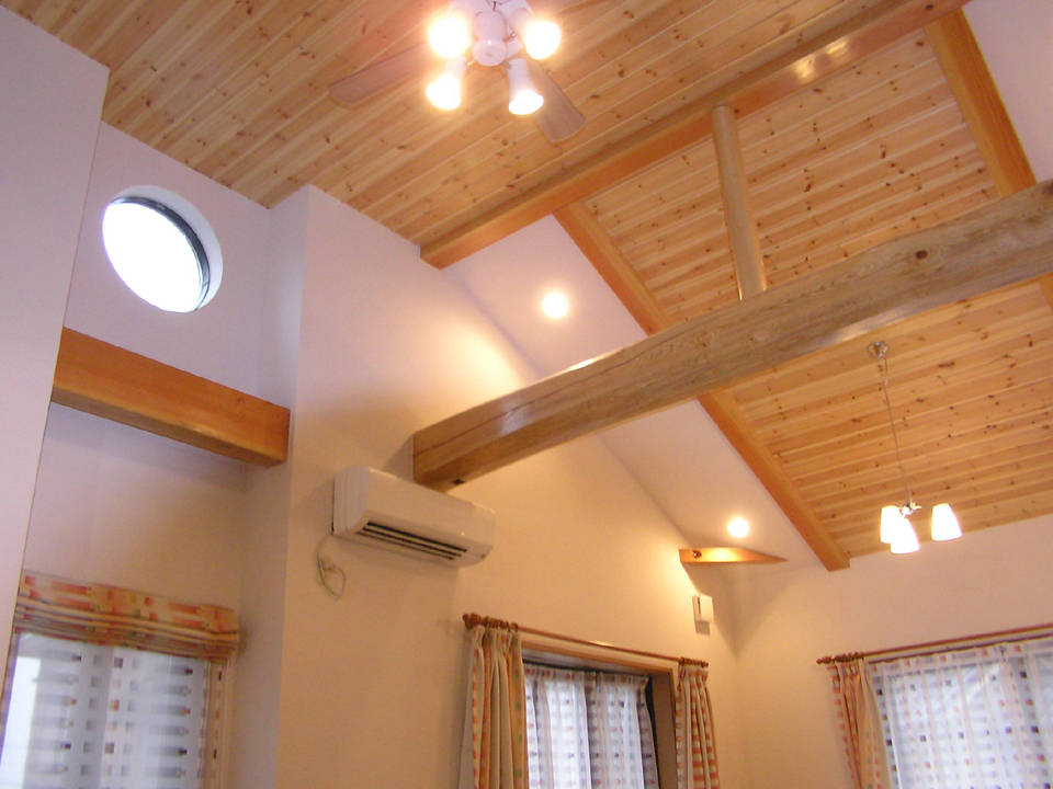 • 骨組みを支える丸太の梁をリビング・ダイニングの天井に見せました
