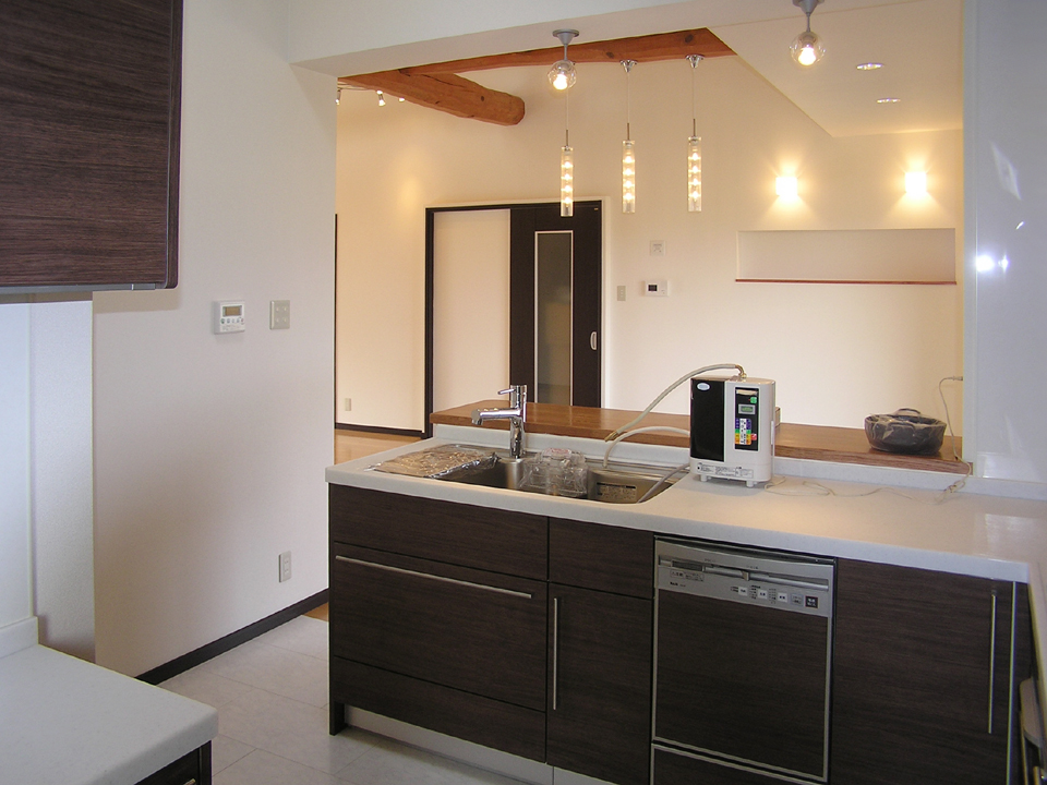 S様邸内観リフォーム前はリビングとダイニングが仕切られていました。その部分を開放し、フラットな天井を取り除き現れた梁。天井が高く開放感がある部屋に仕上がりました。