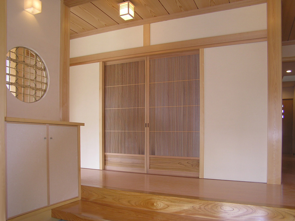 • 玄関ホールごしに 丸窓・千本格子の建具を