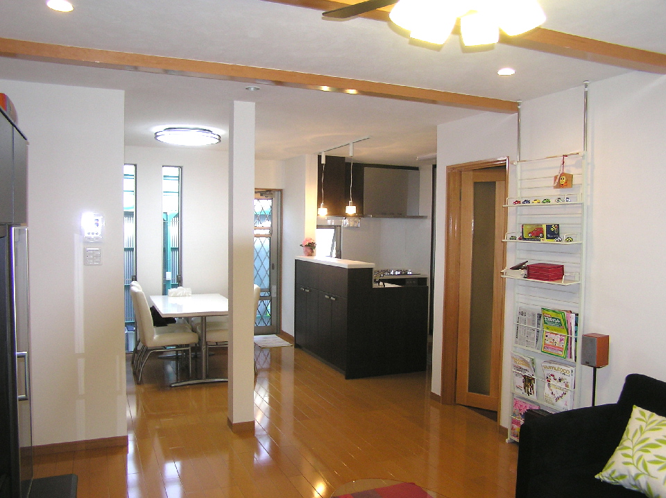 個別だったリビング・DK間の間仕切り壁を壊し、一間続きのLDKにリフォームしました。暗かったDKも明るくなり、また壁天井にはお客様の大好きな色である白色の珪藻土を塗りました。珪藻土って、とてもシックな感じに仕上がって大好きです。(大塚材木店社長(^◇^))