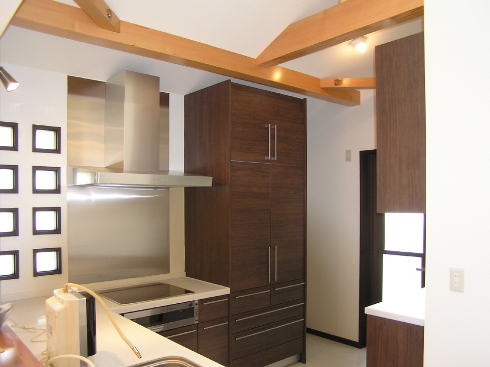 木目調で統一された対面式システムキッチン