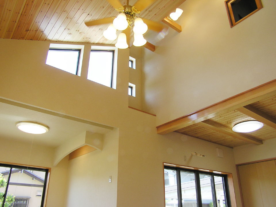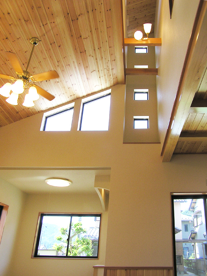 天井を高くし小さな小窓から光が差し込める快適なリビング
