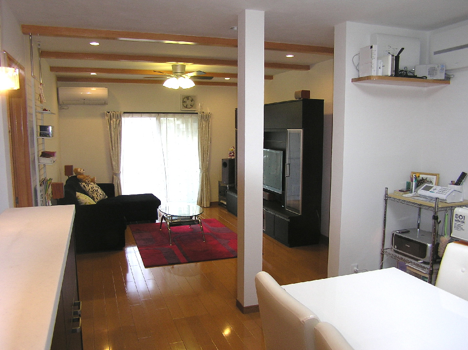 個別だったリビング・DK間の間仕切り壁を壊し、一間続きのLDKにリフォームしました。暗かったDKも明るくなり、また壁天井にはお客様の大好きな色である白色の珪藻土を塗りました。珪藻土って、とてもシックな感じに仕上がって大好きです。(大塚材木店社長(^◇^))
