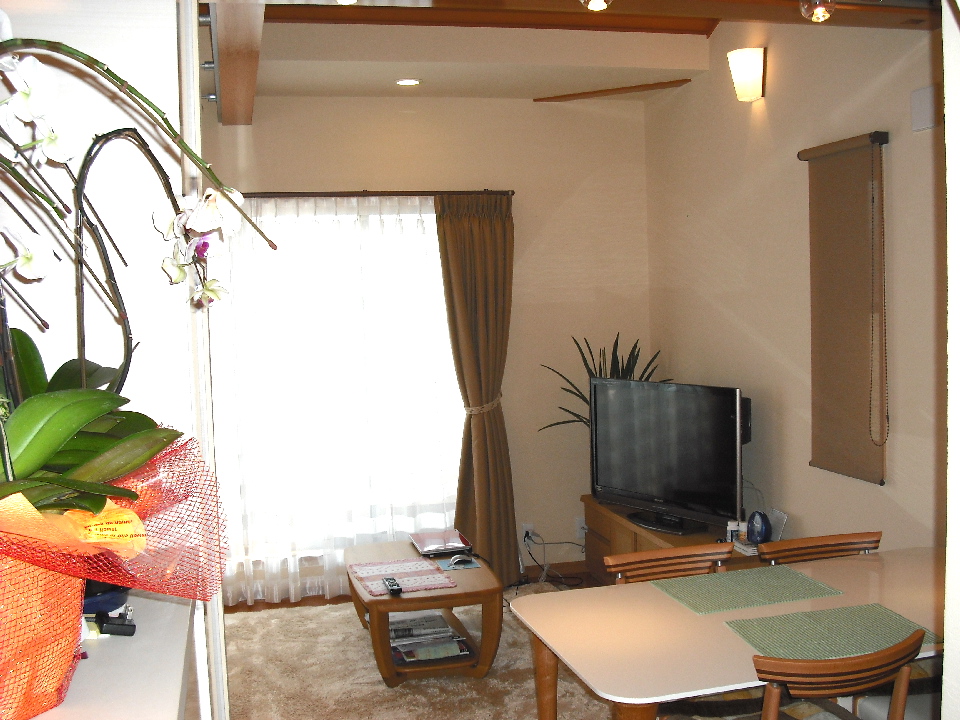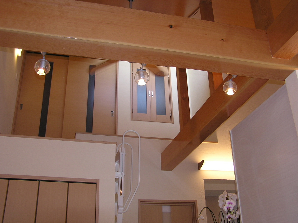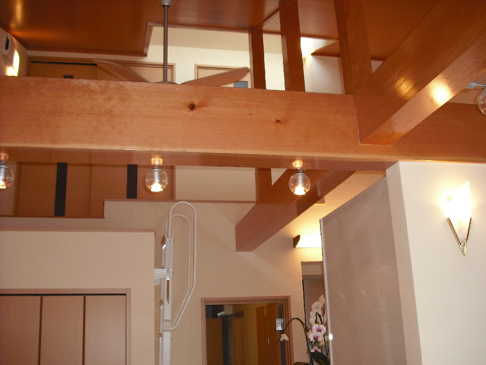 壁には珪藻土塗り壁、また天井を斜め天井とし、材木屋の利点を生かした無垢梁、板をふんだんに使用しました。帰宅した際には、仕事の疲れがいつも癒されるような空間に仕上がったと思います(^o^)