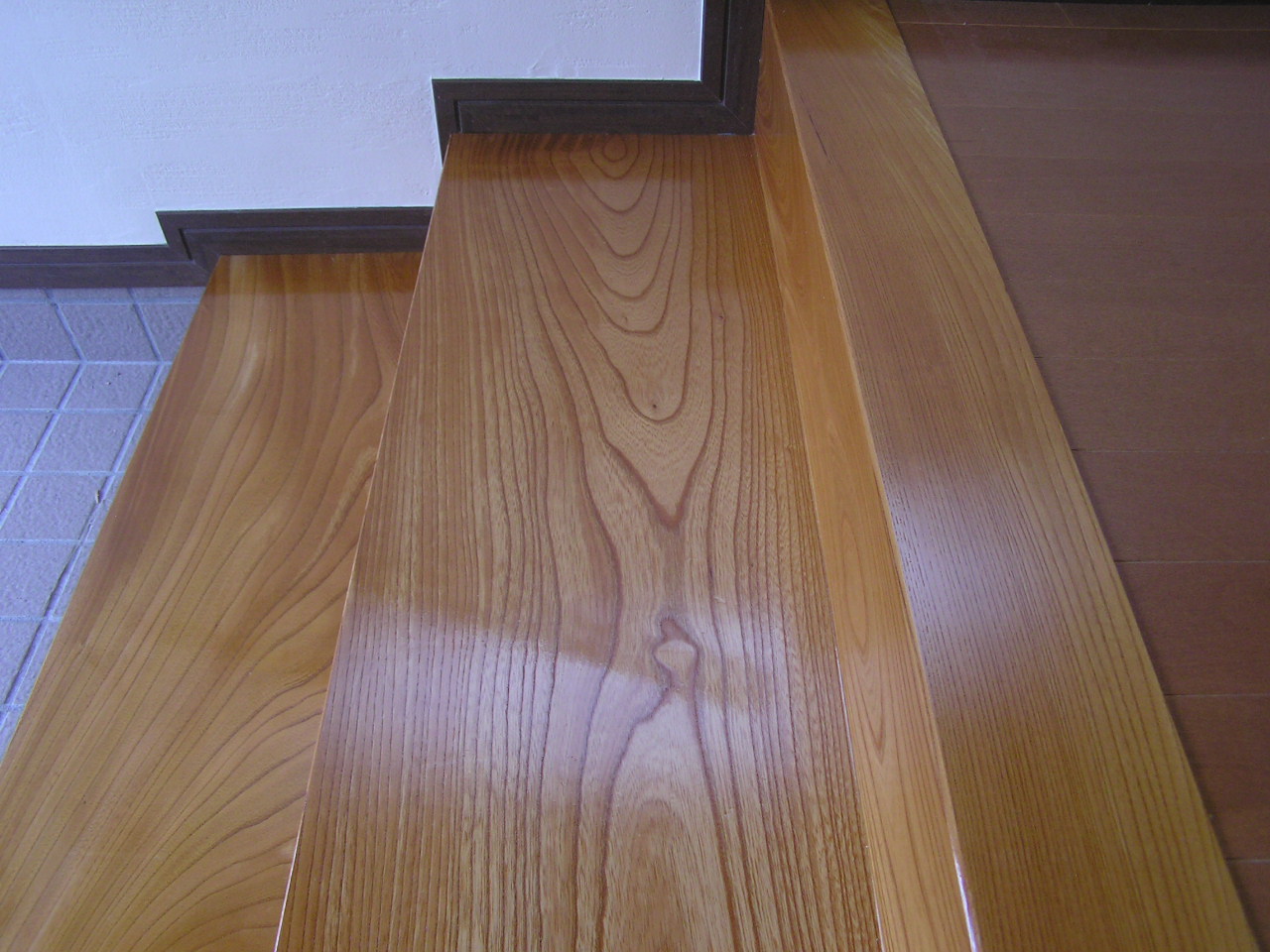 上がりにくかった玄関を解消(材木屋ならでわのケヤキ無垢材を使用)