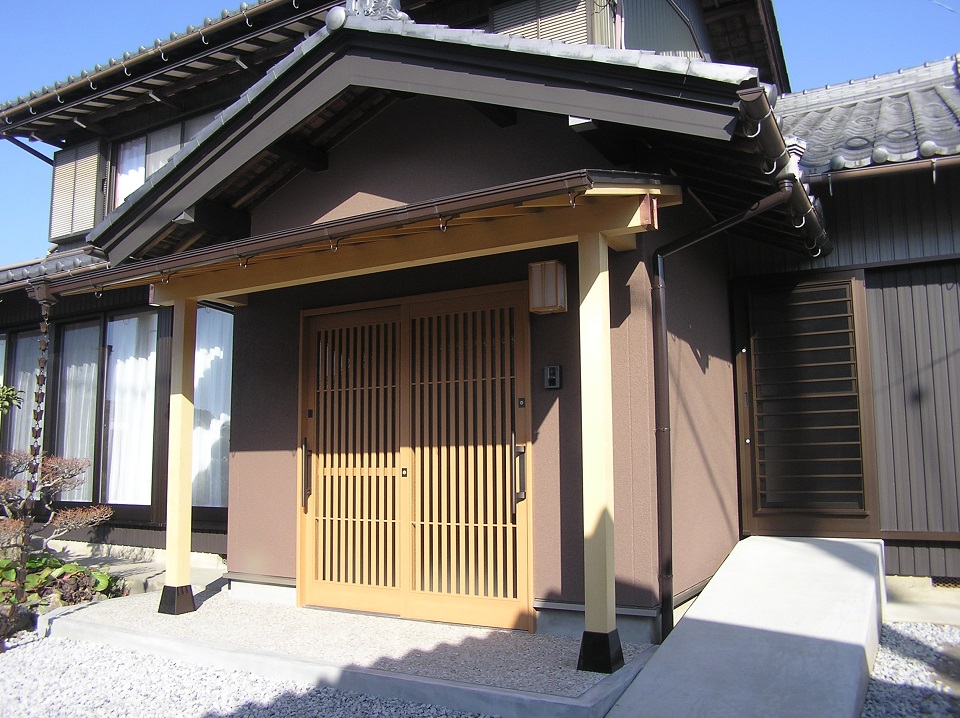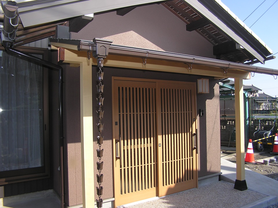 玄関切りよけ庇から独立柱を建て屋根を深く出しました。