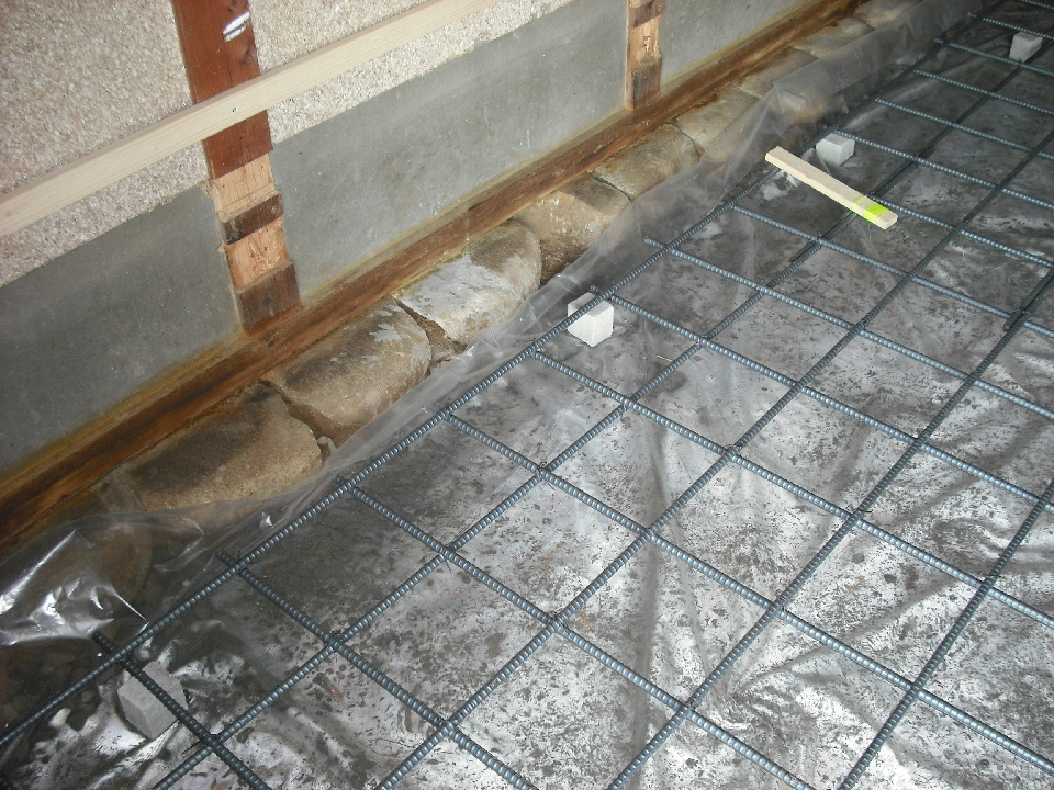 石でできている昔ながらの基礎を、鉄筋コンクリートにより根固め