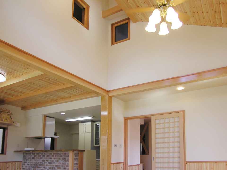 天井を高くし小さな小窓から光が差し込める快適なリビング