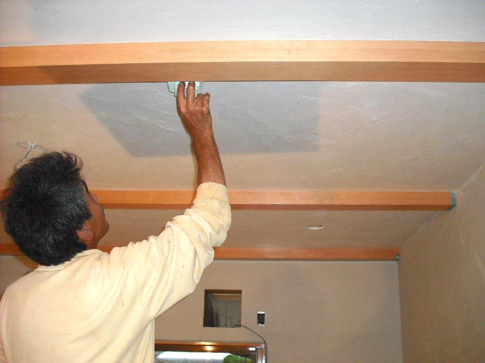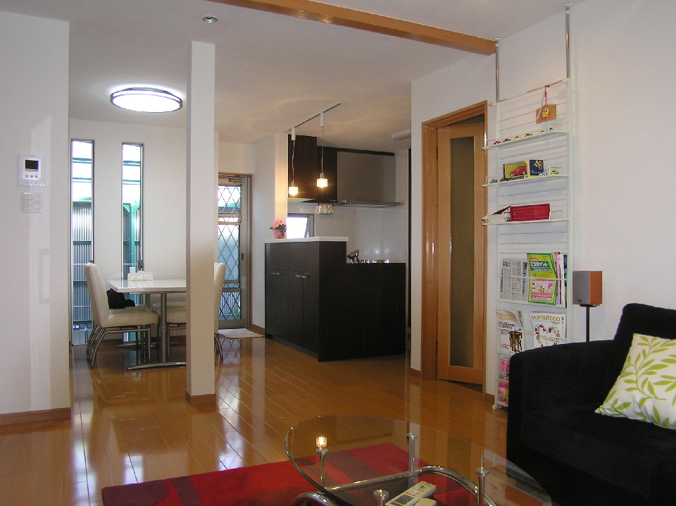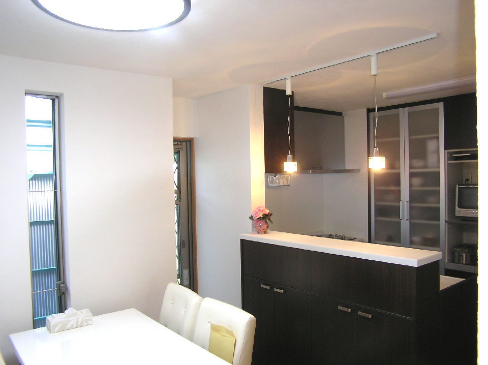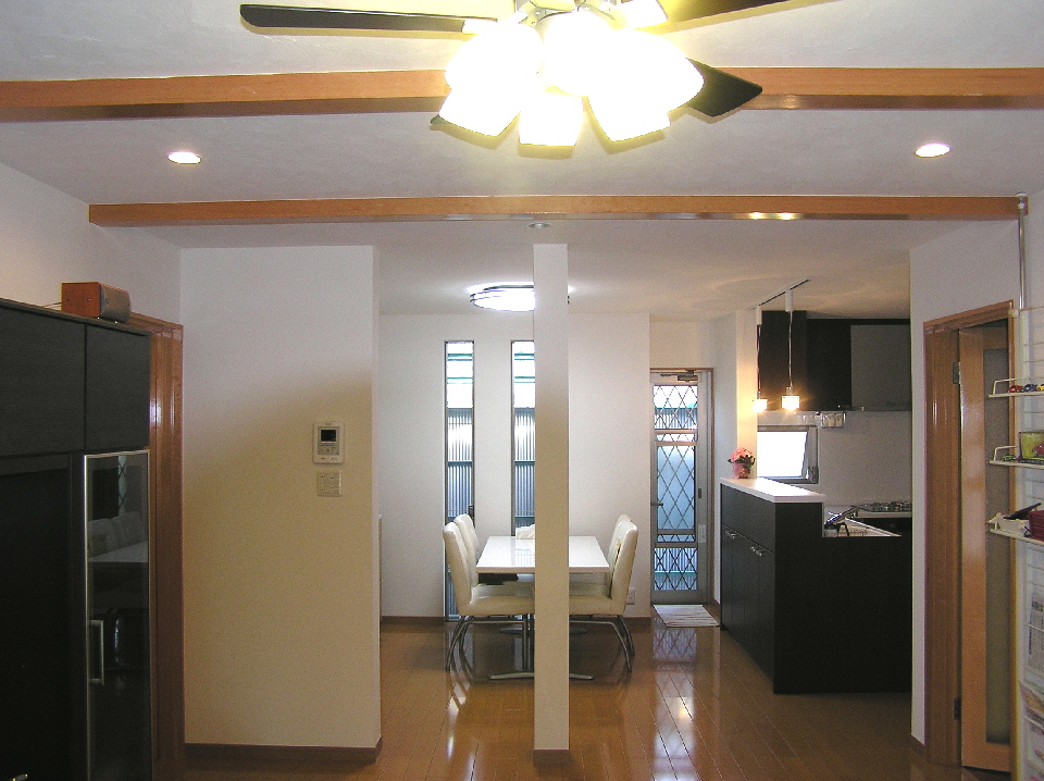 個別だったリビング・DK間の間仕切り壁を壊し、一間続きのLDKにリフォームしました。暗かったDKも明るくなり、また壁天井にはお客様の大好きな色である白色の珪藻土を塗りました。珪藻土って、とてもシックな感じに仕上がって大好きです。(大塚材木店社長(^◇^))
