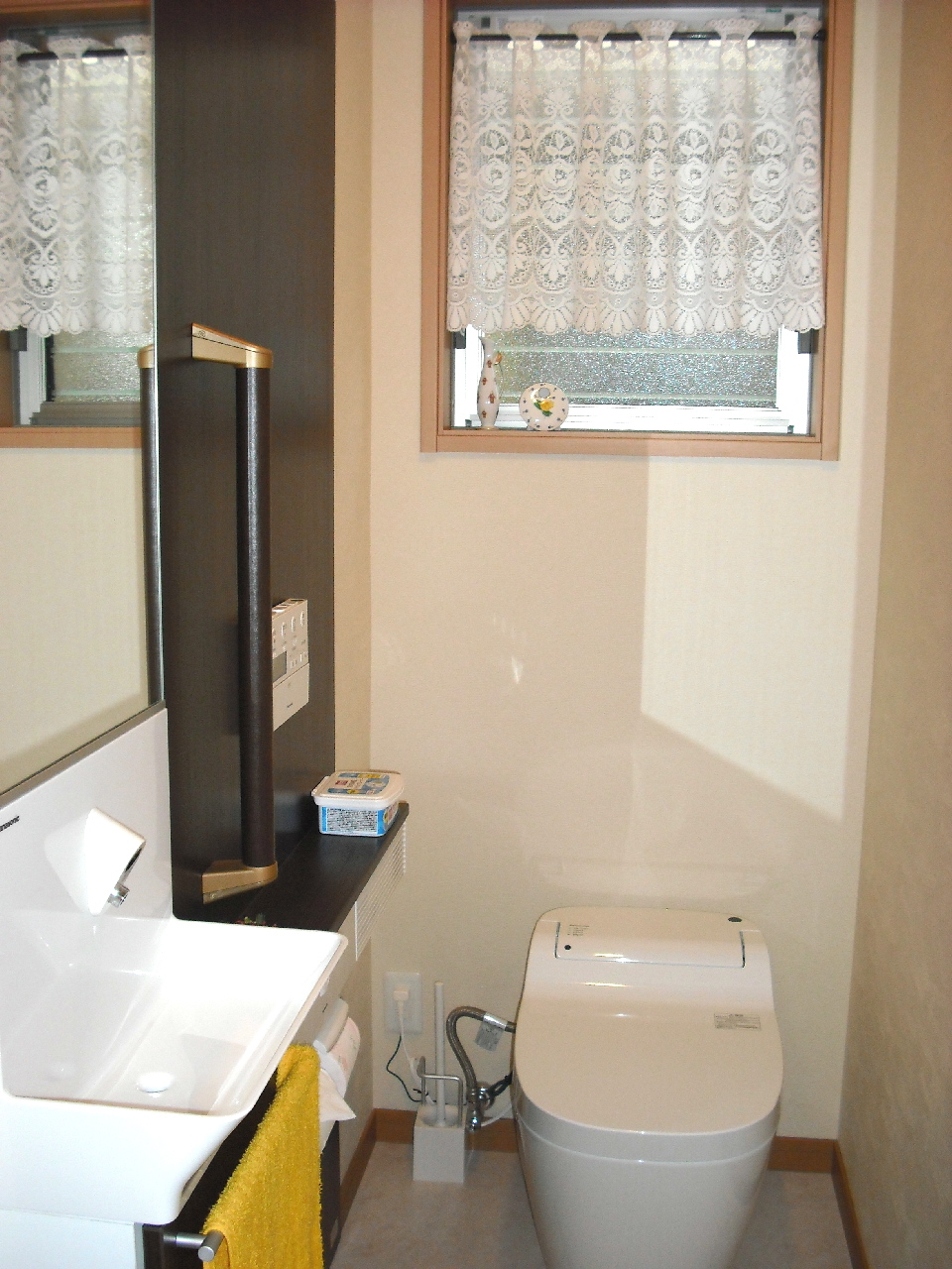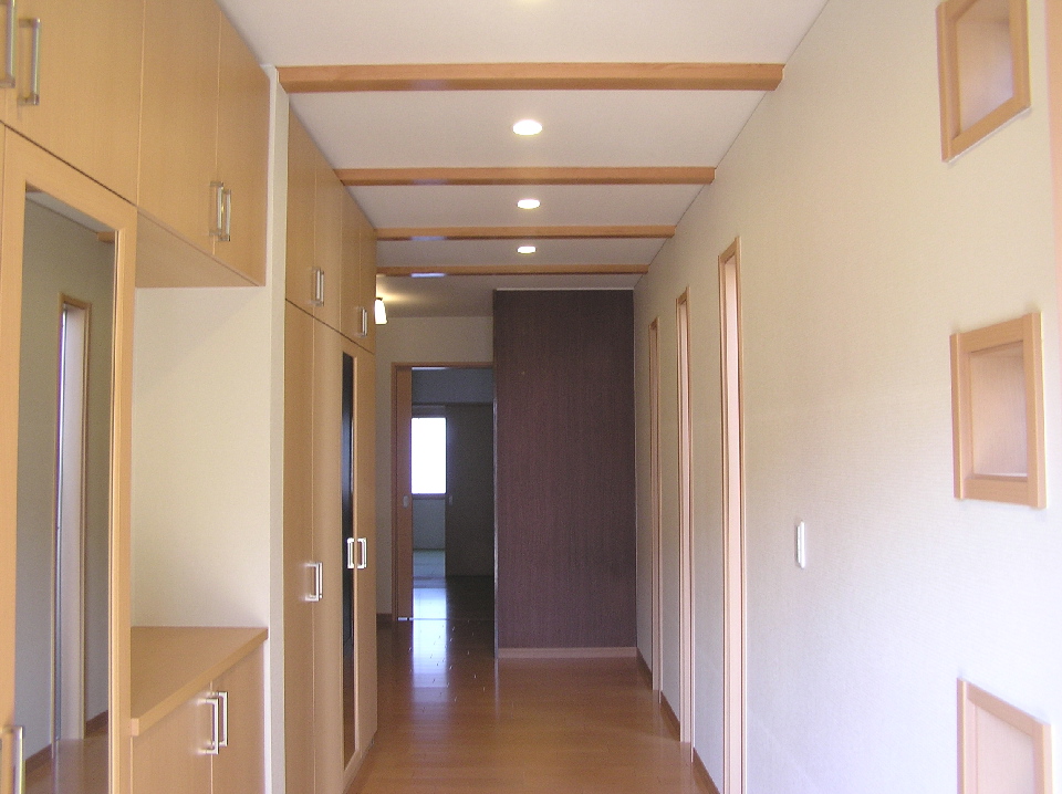 壁には珪藻土塗り壁、また天井を斜め天井とし、材木屋の利点を生かした無垢梁、板をふんだんに使用しました。帰宅した際には、仕事の疲れがいつも癒されるような空間に仕上がったと思います(^o^)